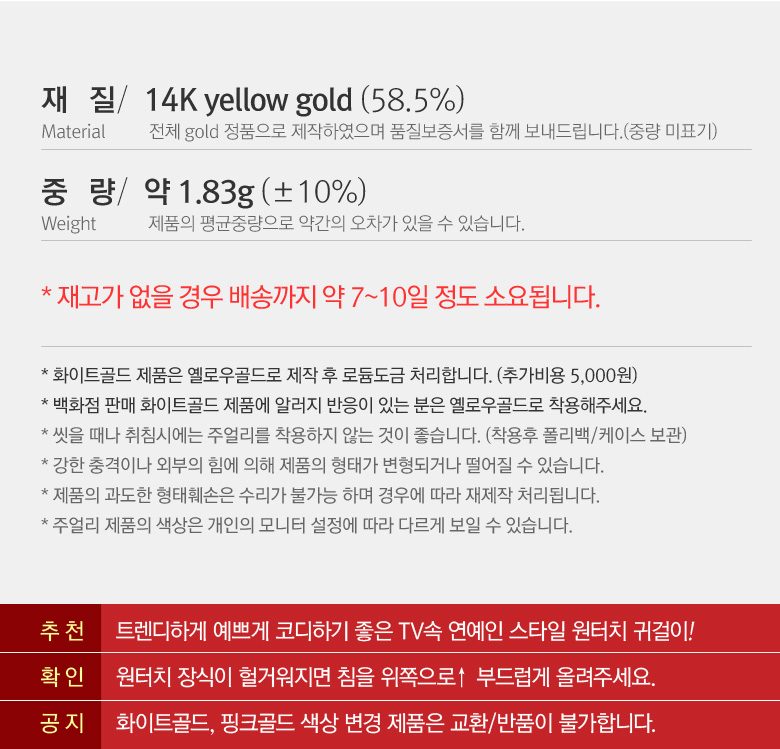 주의사항 백화점에서 판매하는 white gold 제품에 알러지 반응이 있는 고객은 yellow gold로 착용해주세요.